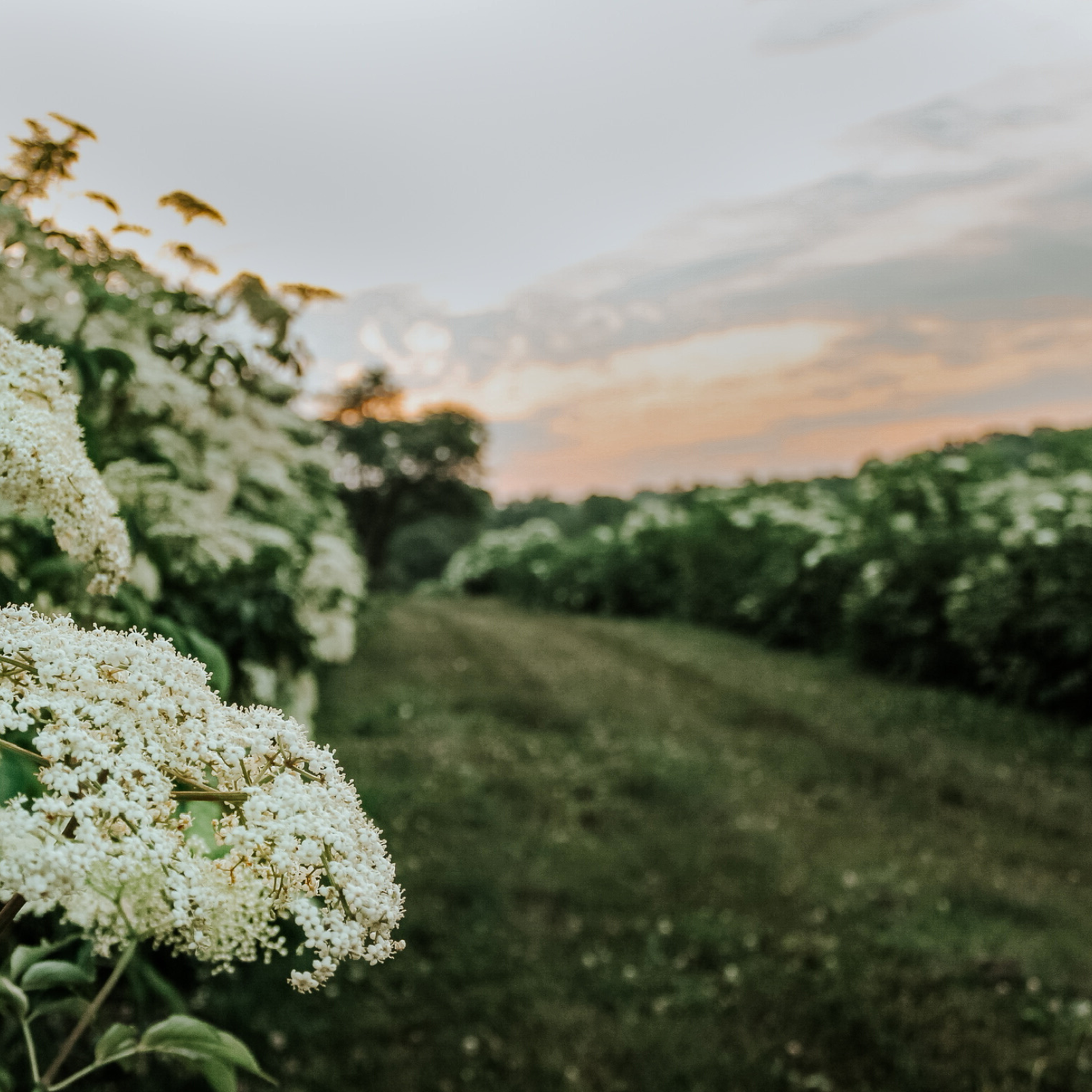 …and come enjoy a laid-back evening among the elderflowers, where the air is lightly scented and the rows of blooming elderberry create a cozy, tucked-away setting.